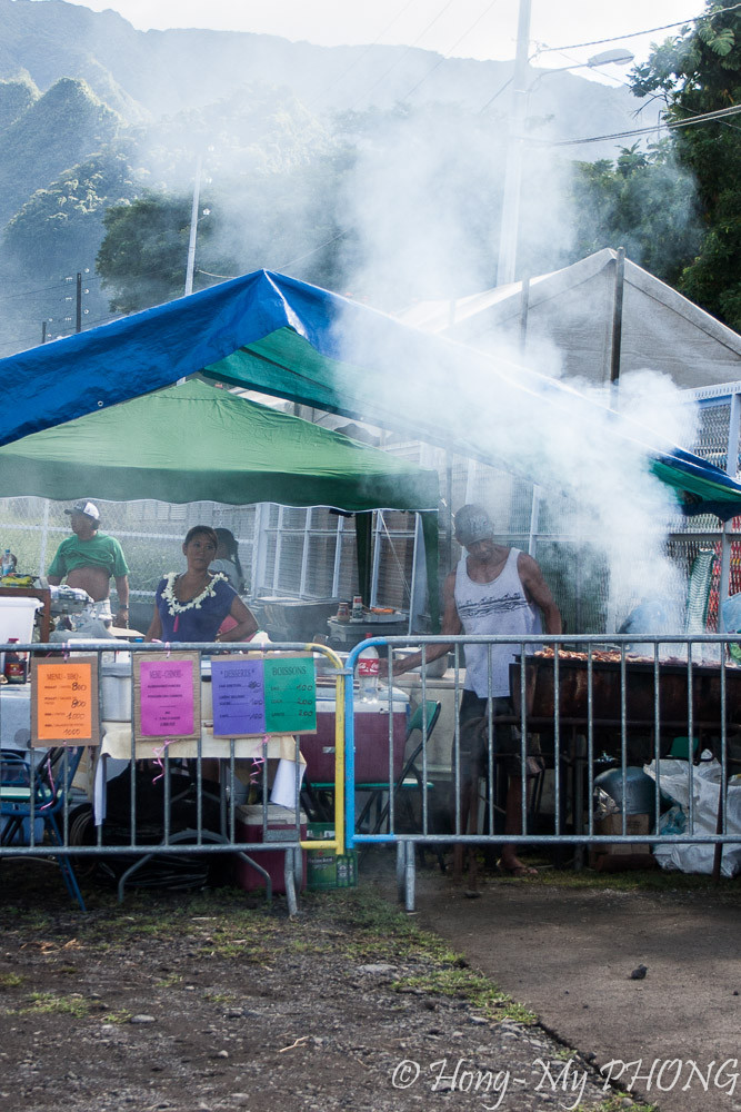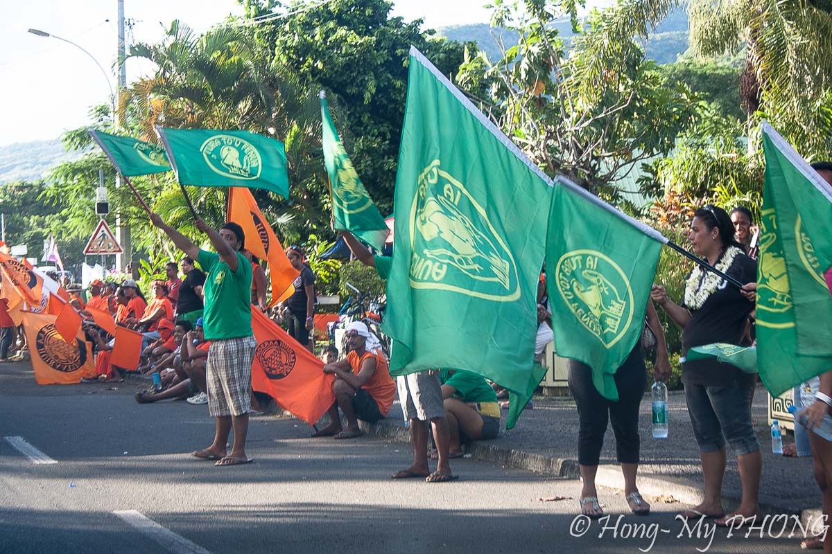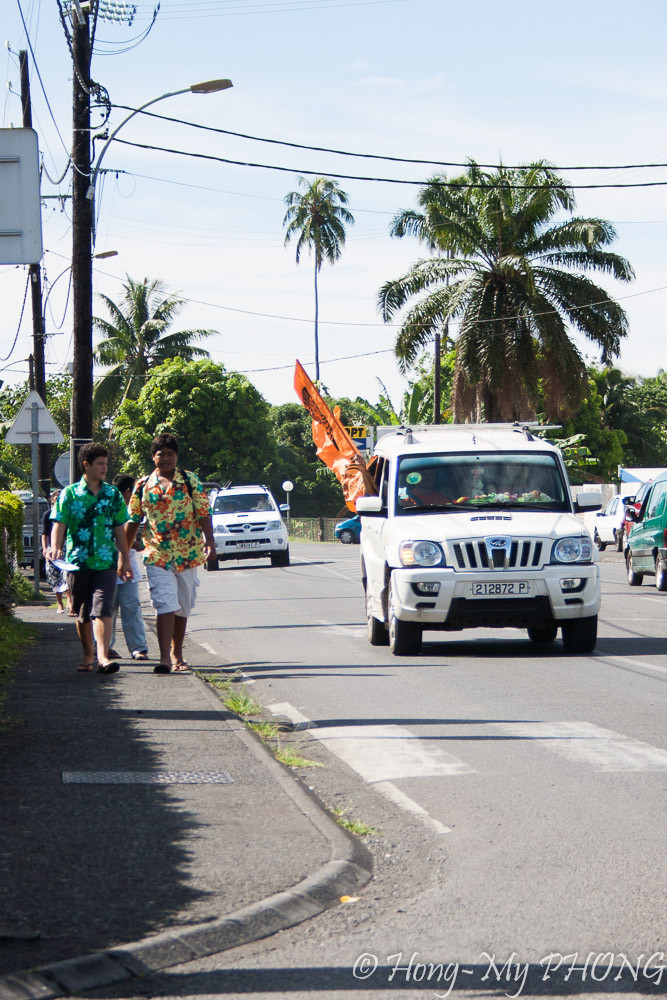 En passant devant la Mairie de Paea, je vois des partisans au bord de la route. Ils crient quelque chose que je ne comprends pas. Je n'hésite pas un instant, c'était exactement ce que je cherchais à photographier, et je shoote d'une main en tenant mon volant de l'autre. Exercice périlleux s'il en est que je vous déconseille fortement.