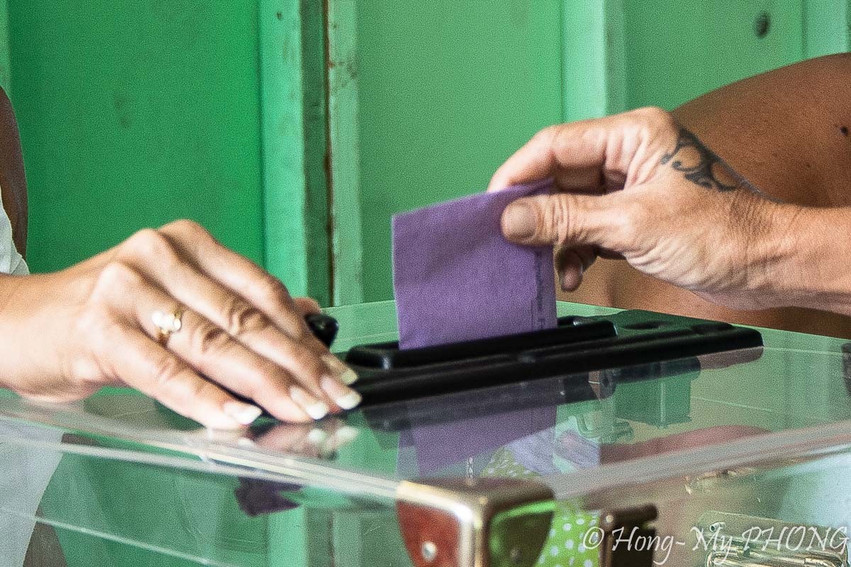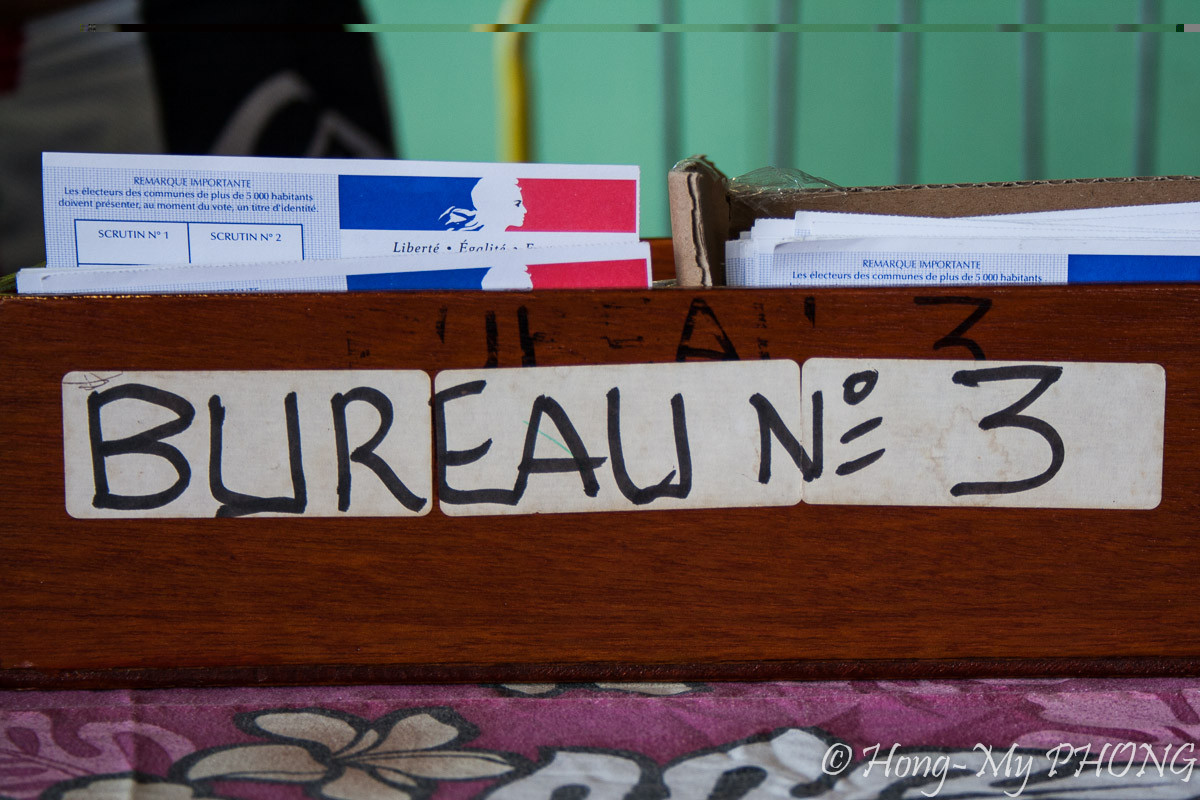 C'est Melle Ariirau Sandras, belle et gracieuse Première Dauphine de Miss Tahiti 2012, qui va me donner ma toute nouvelle carte électorale.Je me rends à mon bureau de vote et là encore une autre surprise m'attend, Melle Heilanie Aukara, Miss Papara 2012 m'accueille avec le sourire. J'en ai de la chance ! J'ai bien fait d'apporter mon appareil photo.