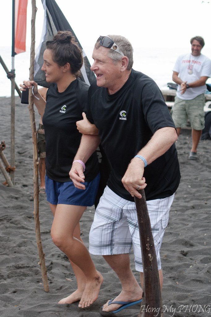 Lorsqu'on appelle Murray Weir dans la catégorie Robb ( 55 ans et plus), ce dernier arrive au bras d'une jeune fille et une canne improvisée ( branche de cocotier) en riant. " I am old", dit-il.